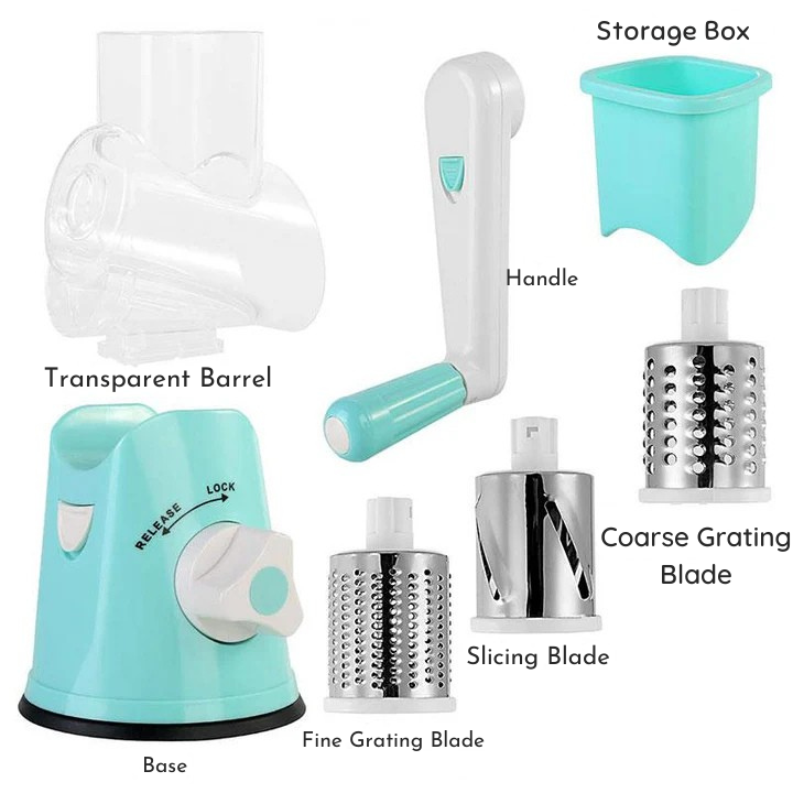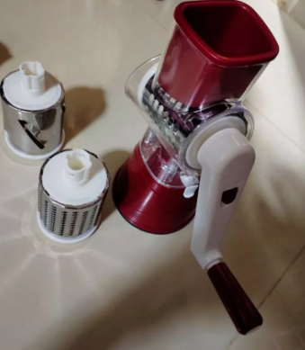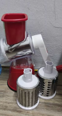 Das Produkt enthält drei austauschbare Klingen: eine zum Schneiden, eine zum feinen Reiben und eine zum groben Reiben.